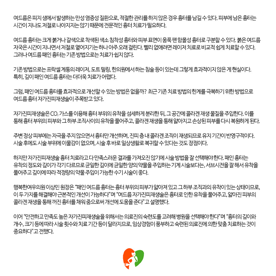 자가진피재생술을 통한 여드름 흉터 치료에 대해 더 알고 싶다면 이상민 원장님의 인터뷰를 담은 언론보도를 봐주세요!