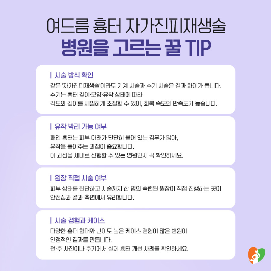 특히 오랜 시간 자신감을 떨어뜨린 흉터라면 단순한 선택보다 내 피부에 맞는 정밀한 과정을 찾는 것이 더 나은 결과로 이어집니다.