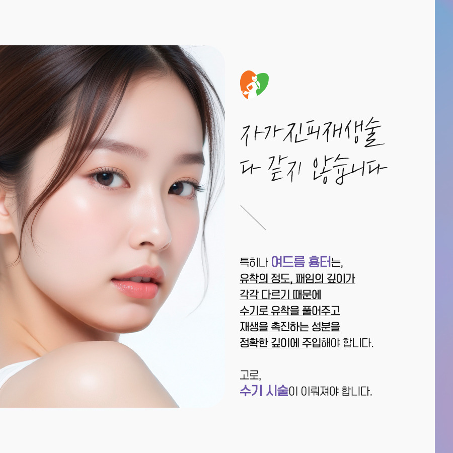 이럴 때 효과적인 접근이 바로 수기 자가진피재생술인데요. 숙련된 의료진이 직접 손으로 바늘 각도, 깊이, 주입량을 조절하며 각 흉터에 맞게 치료하는 방식이랍니다. 장비로는 놓치기 쉬운 부분까지 맞춤 대응이 가능하다는 점에서 차별성이 크죠.